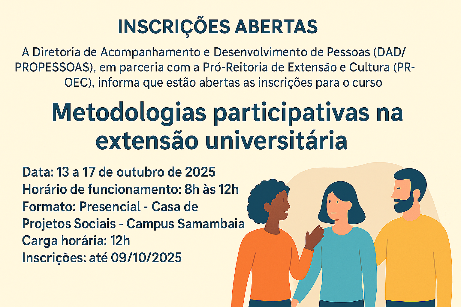 A Diretoria de Acompanhamento e Desenvolvimento de Pessoas (DAD/PROPESSOAS), em parceria com a Pró-Reitoria de Extensão e Cultura (PROEC), abre inscrições para o curso “Metodologias participativas na extensão universitária”.
